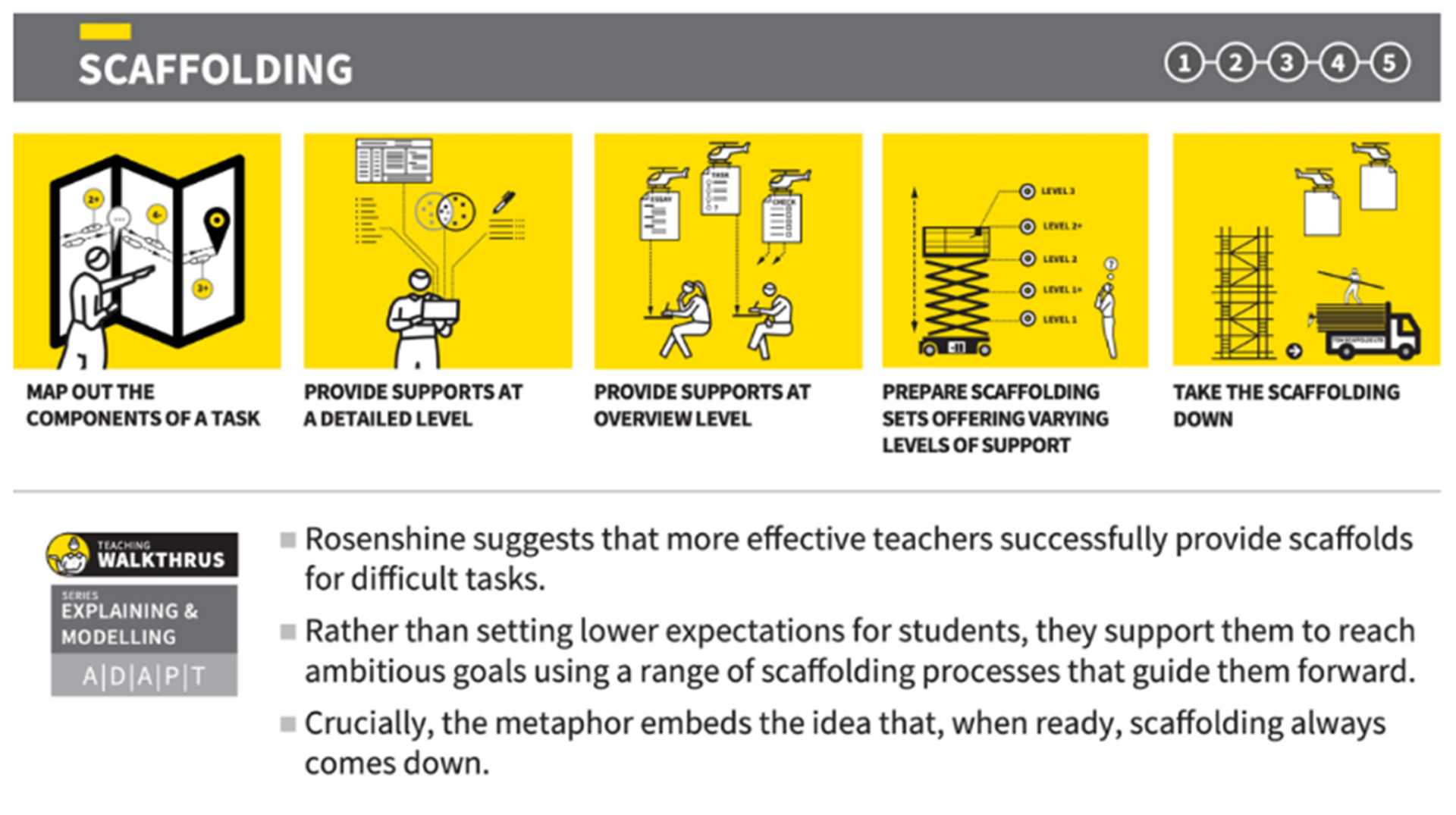 Amongst others, Rosenshine stresses the central importance of scaffolding. This WALKTHRU is supported by many others we use as a school, including: sequence concepts in small steps; worked examples and backward fading; tiered questions and problems; check for understanding and ‘I do, we do, you do’.